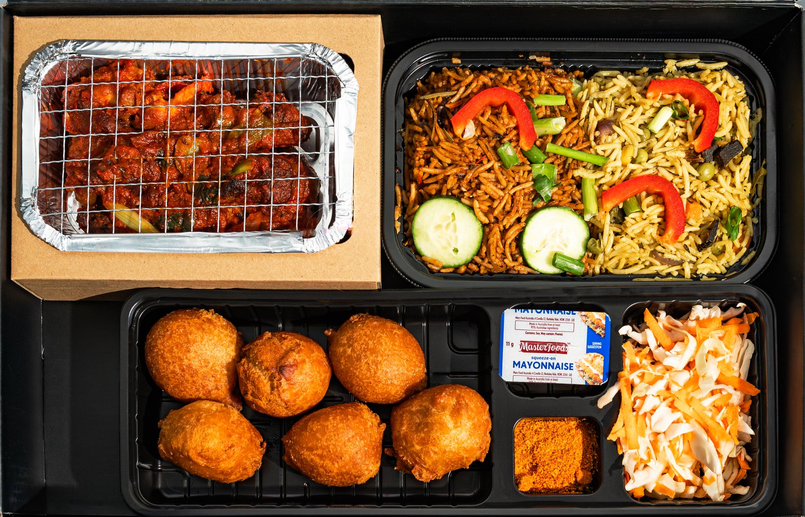 At the heart of this box is the iconic Jollof Rice, perfectly paired with tender stewed chicken simmered in a rich, savoury sauce. To balance the meal, you’ll find fresh coleslaw with creamy mayo, adding a cool and refreshing crunch. Rounding out the experience is the beloved Puff Puff — soft, golden, and lightly sweet, providing the perfect finish to a hearty feast.