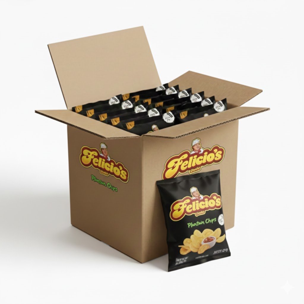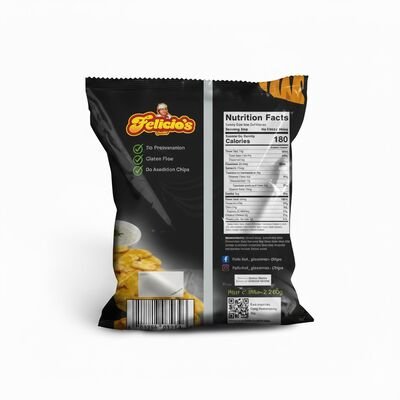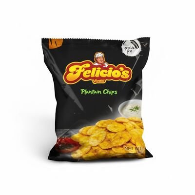 76g of Felicios Plantain Chips: are thinly sliced plantains that are deep-fried or baked until crispy and golden. They are a popular snack across Africa, the Caribbean, and Latin America, loved for their crunchy texture and rich, naturally sweet or savory flavor (depending on the ripeness of the plantain).