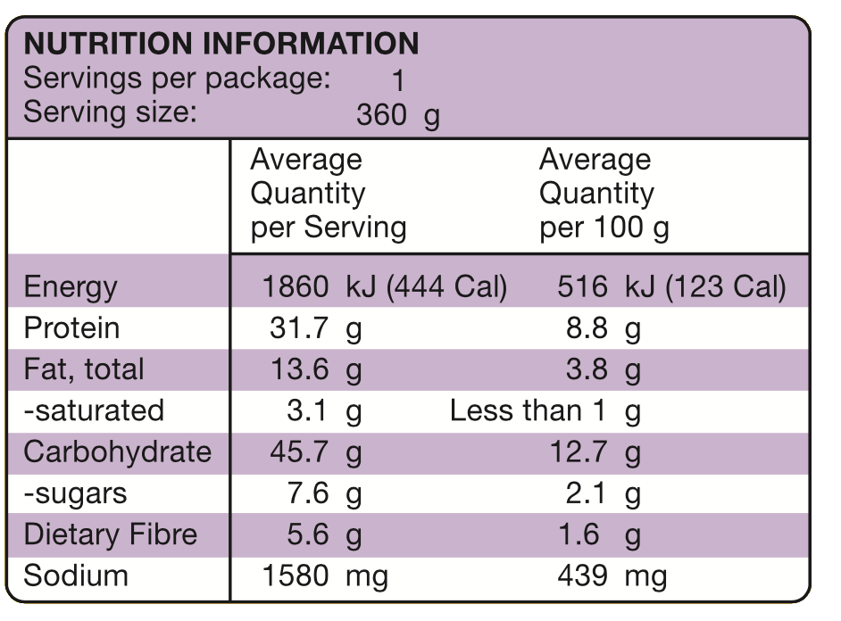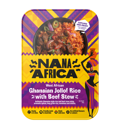 Cooked Basmati Rice (35%) (Water, Basmati Rice, Salt), Vegetables (33%) (Onion, Red Capsicum, Crushed Tomatoes (Food Acid (330)), Diced Tomatoes), Grass Fed Beef (22%), Tomato Paste (Food Acid (330)), Olive Oil, Salt, Crushed Garlic, Ginger, Scotch Bonnet Peppers, vegetable stock (Contains Natural Flavours), Spices, Crushed Chili